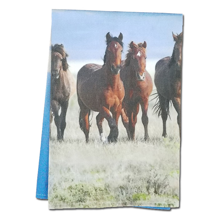 Feiern Sie Wildpferde mit diesem Küchenhandtuch aus 100 % Baumwolle mit dem Mustang „Shy Boy“, der durch den legendären Pferdetrainer Monty Roberts berühmt wurde. Stoff-Aufhängeschlaufe. Größe 15,75" x 23,5"