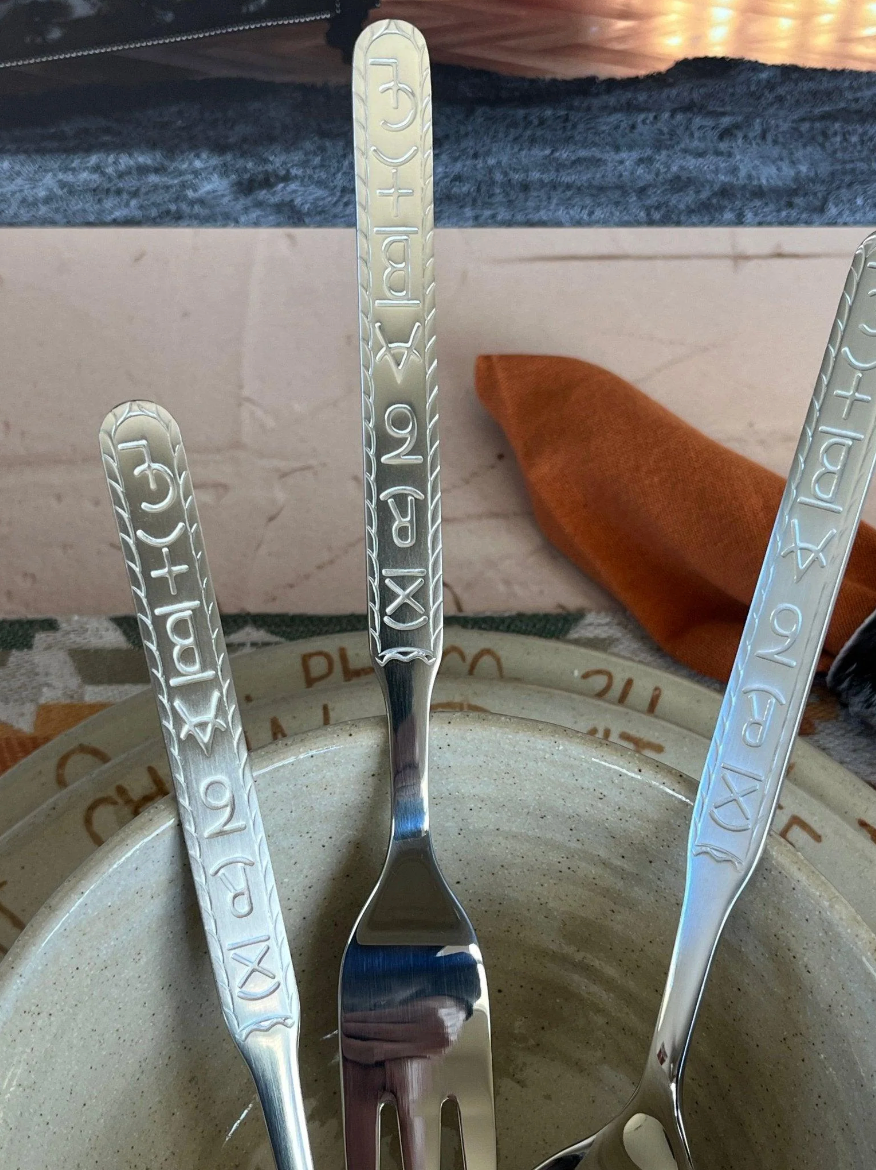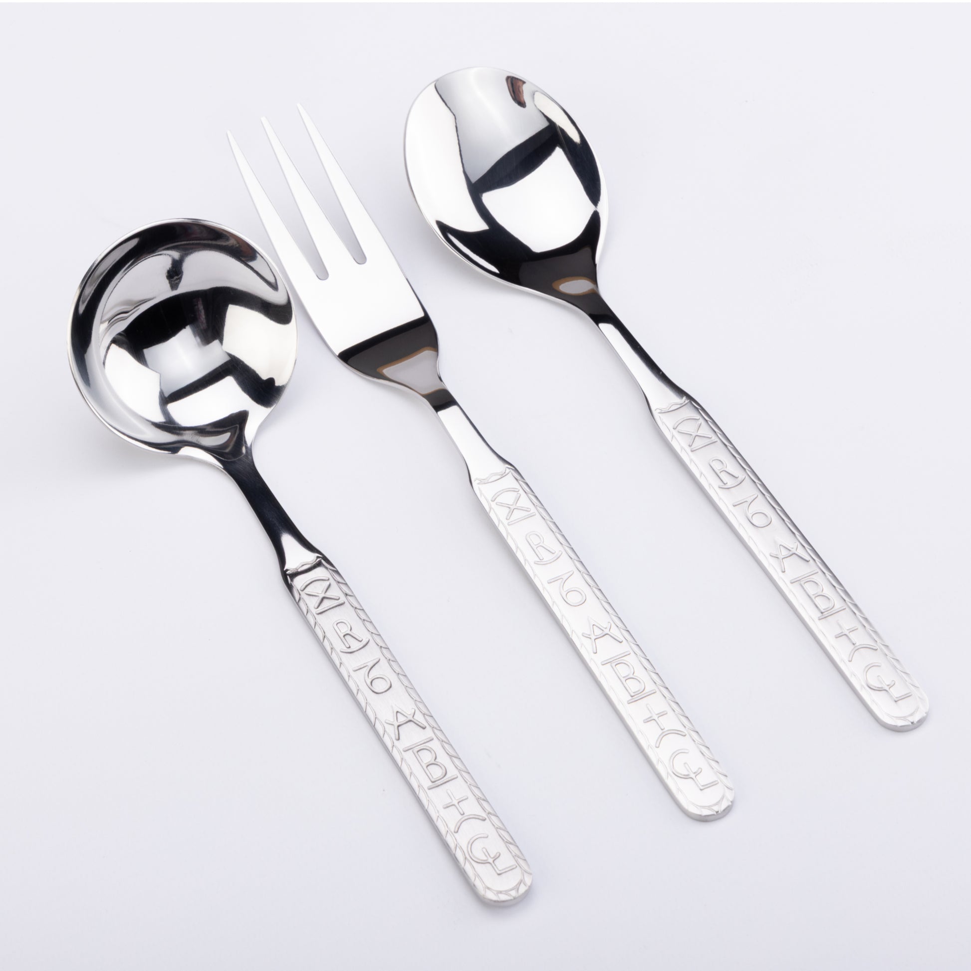 Ranch Brands Edelstahl-Besteck (3-teiliges Servierset) von Cowboy Living – Dieses Edelstahlbesteck ist mit Seilen und echten Ranch-Marken geprägt. Die Griffe haben eine leicht gebürstete Oberfläche, um die Sichtbarkeit unseres Designs zu verbessern. Diese langlebigen Teile eignen sich gleichermaßen für den alltäglichen Gebrauch bei stilvoller Western-Unterhaltung. Das Set enthält einen Servierlöffel (8,75" x 2"), eine Schöpfkelle (7,5" x 2,25") und eine Serviergabel (9" x 1,125"). Spülmaschinenfest.