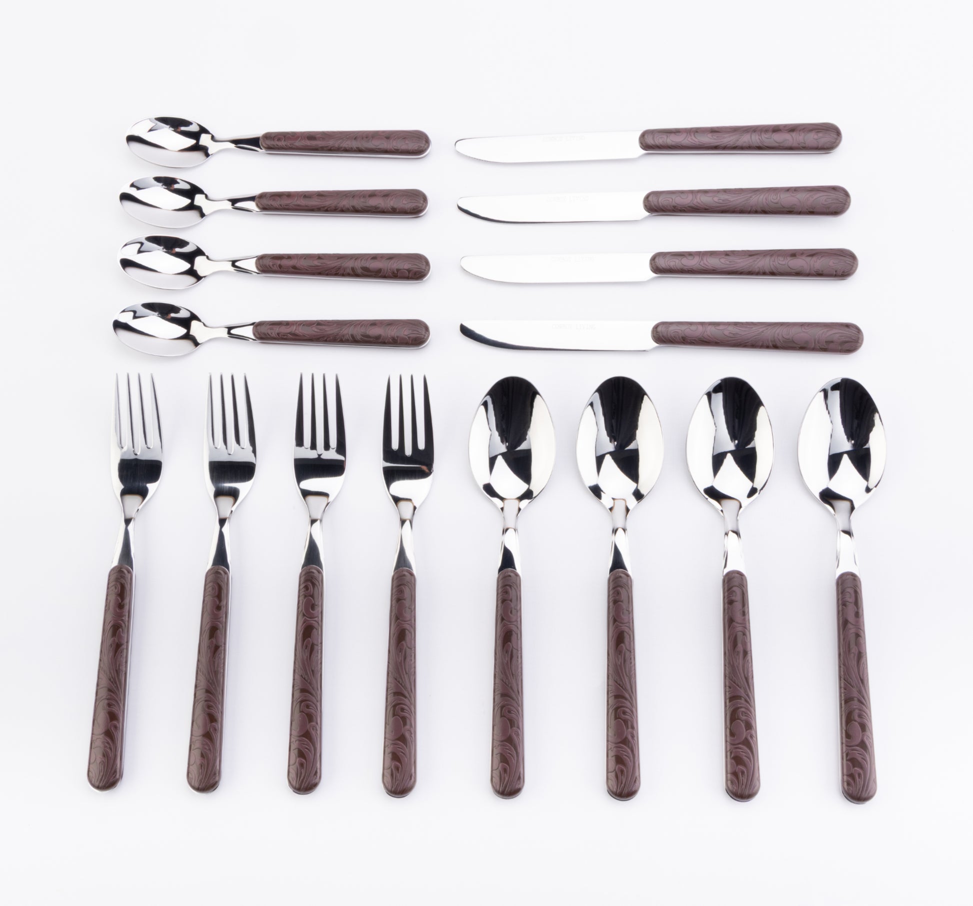 - 16-piece set: 4 dinner forks, 4 dinner knives, 4 tablespoons, 4 teaspoons