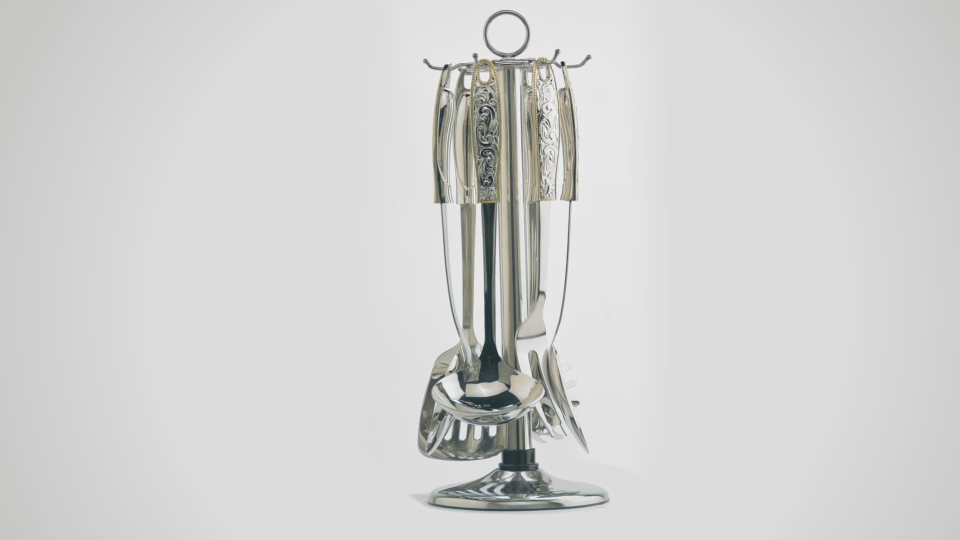 Sechsteiliges Servierset mit langem Griff und Chromständer. Unsere schönen rostfreien Griffe im Western Buckle-Design sind bis hin zur Seilverzierung detailliert. Ihr ausgewogenes Gewicht und ihre hohe Qualität gewährleisten lang anhaltende Leistung und Haltbarkeit. Das Set umfasst unsere Western Buckle-Schöpfkelle, Nudelgabel, Löffel, Schlitzlöffel, Schlitzspatel, Serviergabel und unseren runden Präsentationsständer.