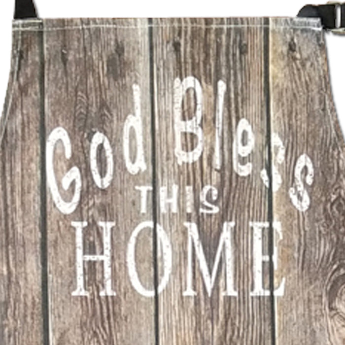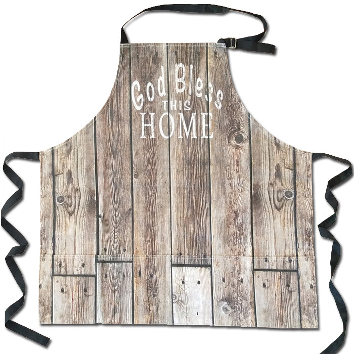 Show your faith with this 100% cotton kitchen apron featuring a barnwood background. Front pockets and adjustable neck strap. One size fits all. Size 27.5" x 23.5"