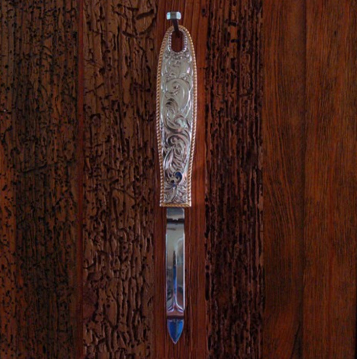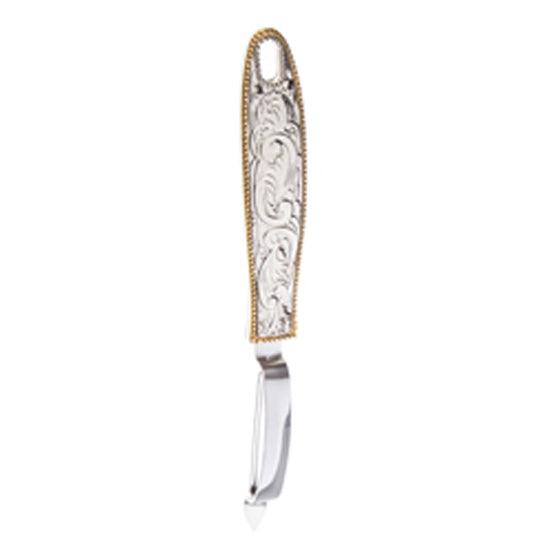 Beautiful stainless handle resembles a tooled western belt buckle with genuine gold plated rope trim. A useful helper for removing the skin of any fruit or vegetable, or for creating parmesan curls. Dishwasher safe.